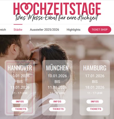 Die Hochzeitsmesse Hochzeitstage 2026 findet nach alter Tradition im Congresszentrum in Hannover statt. Besuchen Sie uns am 10.1.2023 und am 11.1.2023 am Stand 36. Karten erhalten Sie auch über die Webseiten: www.hochzeitstage.de